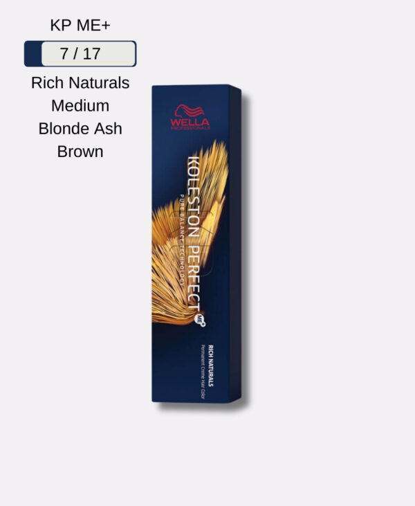 Achieve a sophisticated and natural-looking medium blonde with cool ash undertones using Wella Professionals Koleston Perfect ME+ 7/17 Medium Blonde Ash Brown. This high-performance permanent hair color delivers a rich, nuanced blonde with subtle ash reflects, providing exceptional coverage and shine. Its advanced formula provides up to 100% grey/white hair coverage and long-lasting color intensity, making it ideal for those seeking a refined and elegant medium blonde shade.