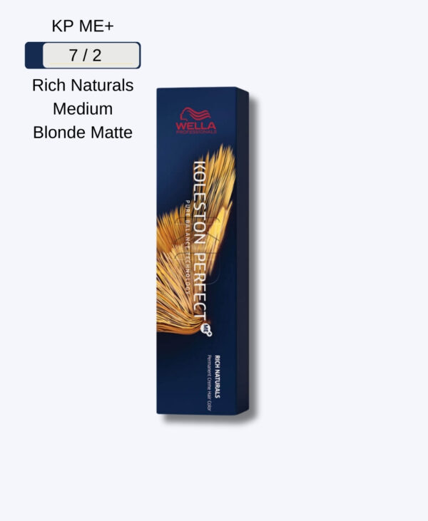 Achieve a sophisticated and cool medium blonde with a modern matt finish using Wella Professionals Koleston Perfect ME+ 7/2 Medium Blonde Matt. This high-performance permanent hair color delivers a rich, nuanced blonde with subtle cool undertones and a velvety texture, providing exceptional coverage and shine. Its advanced formula provides up to 100% grey/white hair coverage and long-lasting color intensity, making it ideal for those seeking a refined and elegant medium blonde shade.