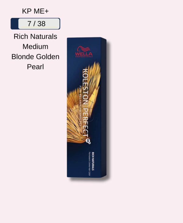 Achieve a radiant and luminous medium blonde with warm golden and pearl undertones using Wella Professionals Koleston Perfect ME+ 7/38 Medium Blonde Golden Pearl. This high-performance permanent hair color delivers vibrant, long-lasting color with exceptional coverage and shine. Its advanced formula provides up to 100% grey/white hair coverage and intense color intensity, making it ideal for those seeking a sophisticated and dimensional medium blonde shade.